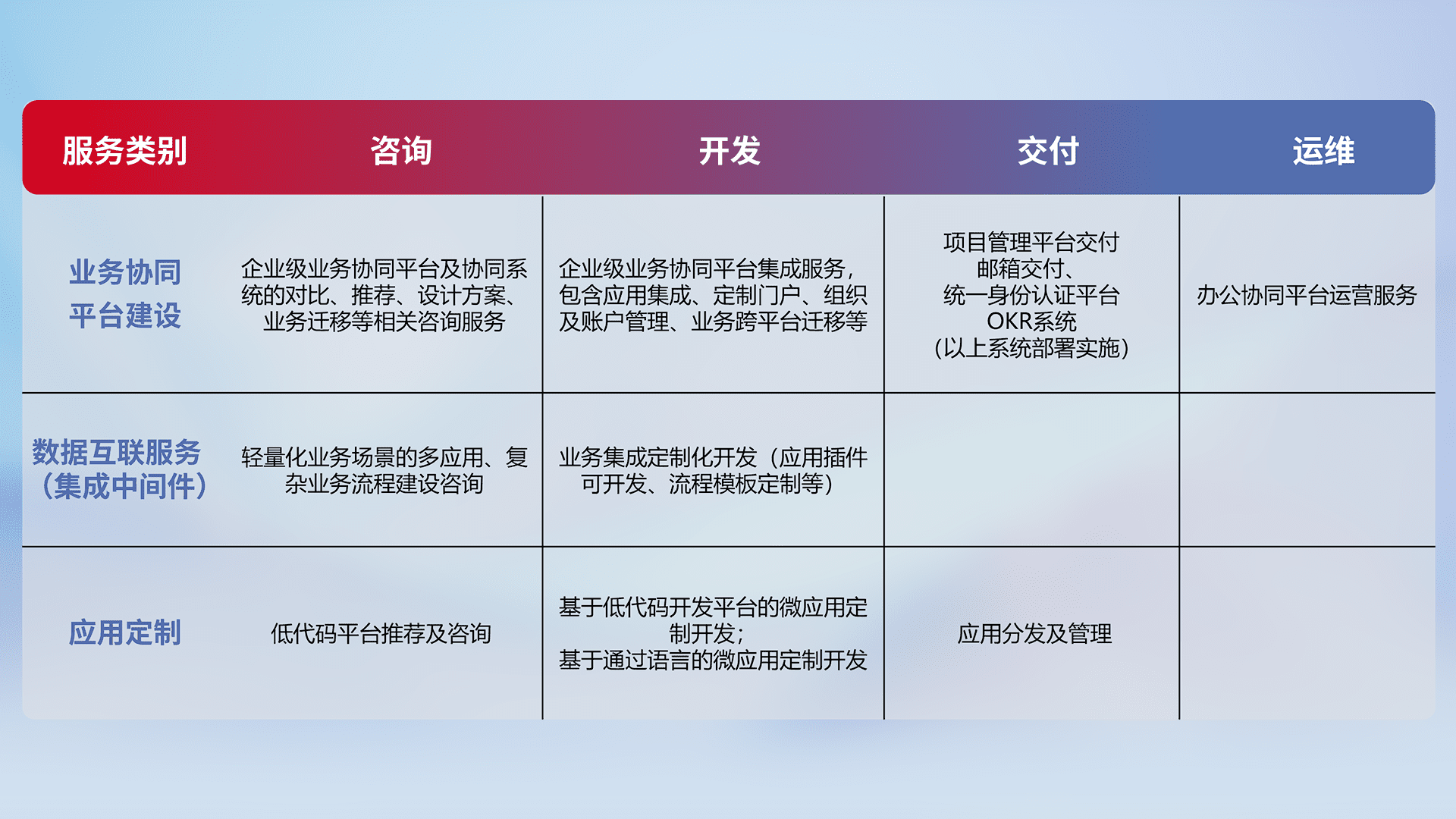 针对钉钉、、企微、、、、IDaas等平台级产品提供产品的规划、、方案、、、交付、、、定制化开发等服务,,,,实现如统一协同办公、、智能客户服务、、混合会议管理、、智能数据查询、、、等业务场景,,,实现数字化转型。。。
