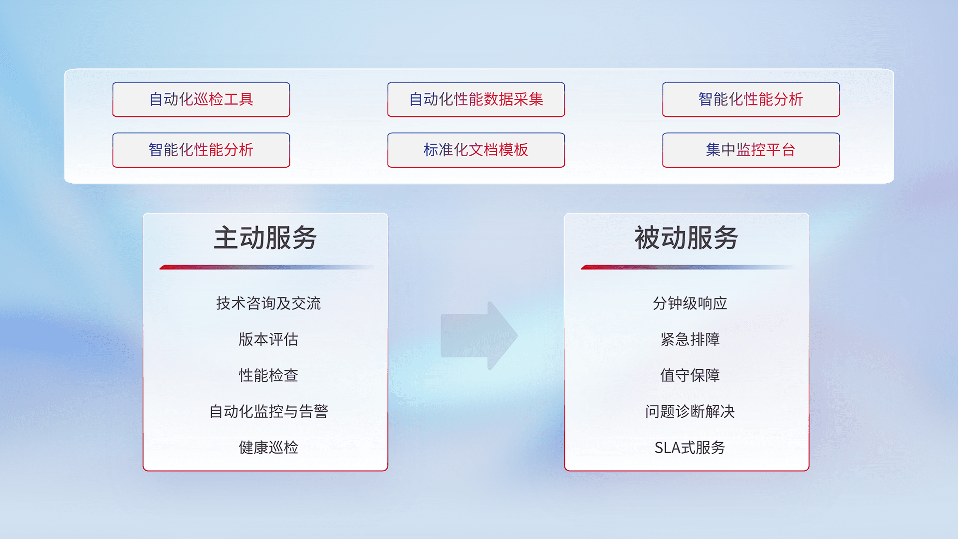 智能化工具和标准化文档,,,,保障服务质量,,,提供主动服务(包含技术咨询、、、版本评估、、性能检查、、、、自动化监控与告警、、、、健康巡检)和被动服务包含(分钟级响应、、紧急排障、、、、值守保障、、、、问题诊断解决、、SLA服务)。。。。