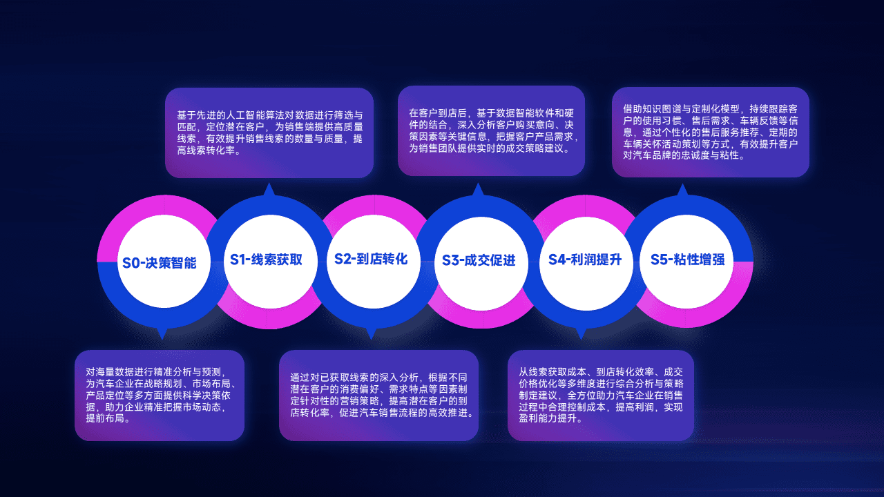 通过拓宽潜在客户来源、、优化线索分配并提高到店转化率,,,以增强销售效率。。。同时,,,利用线索数据不断优化分析模型,,,有效提升转化率,,,,扩大营销影响力。。。。